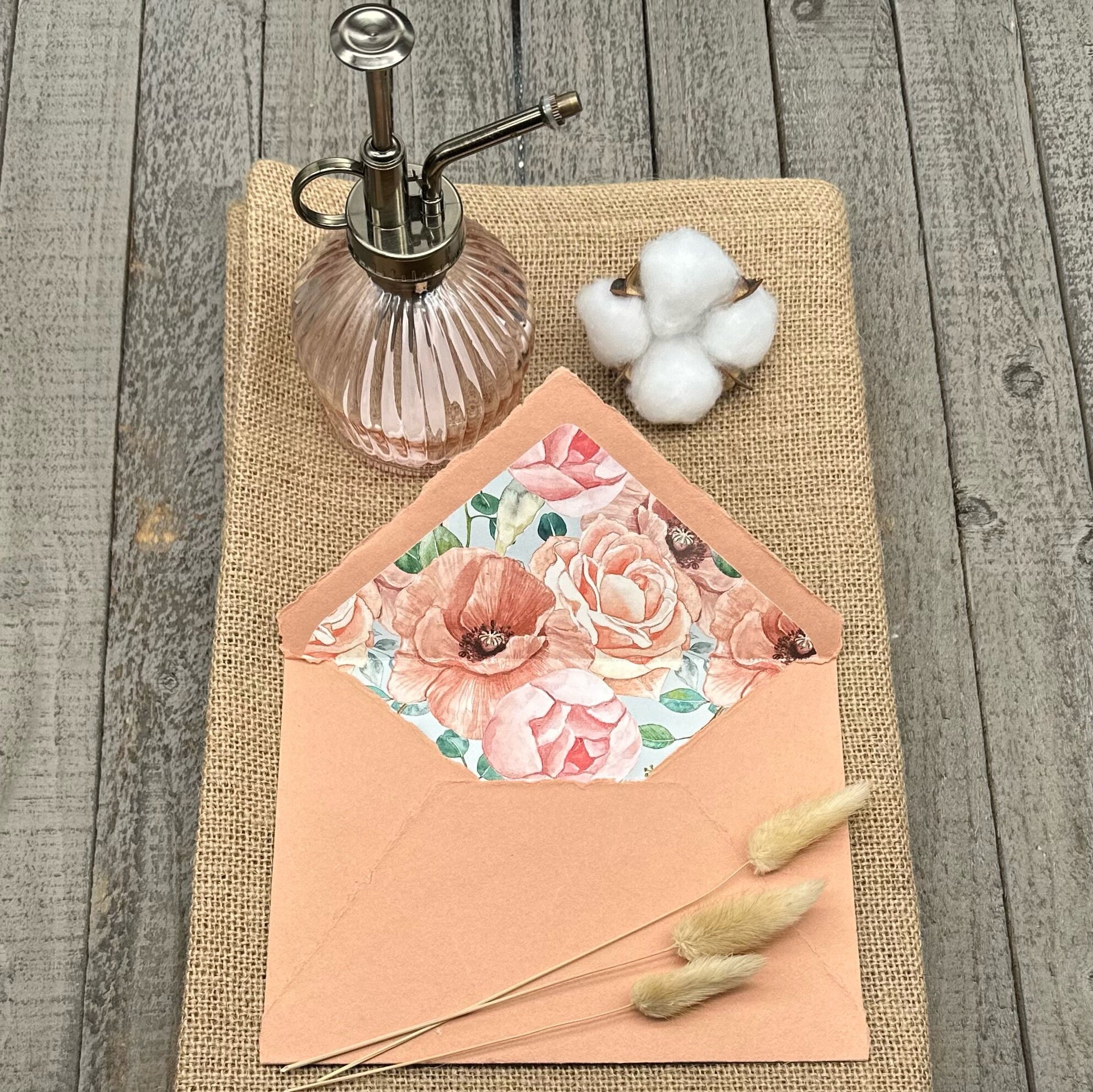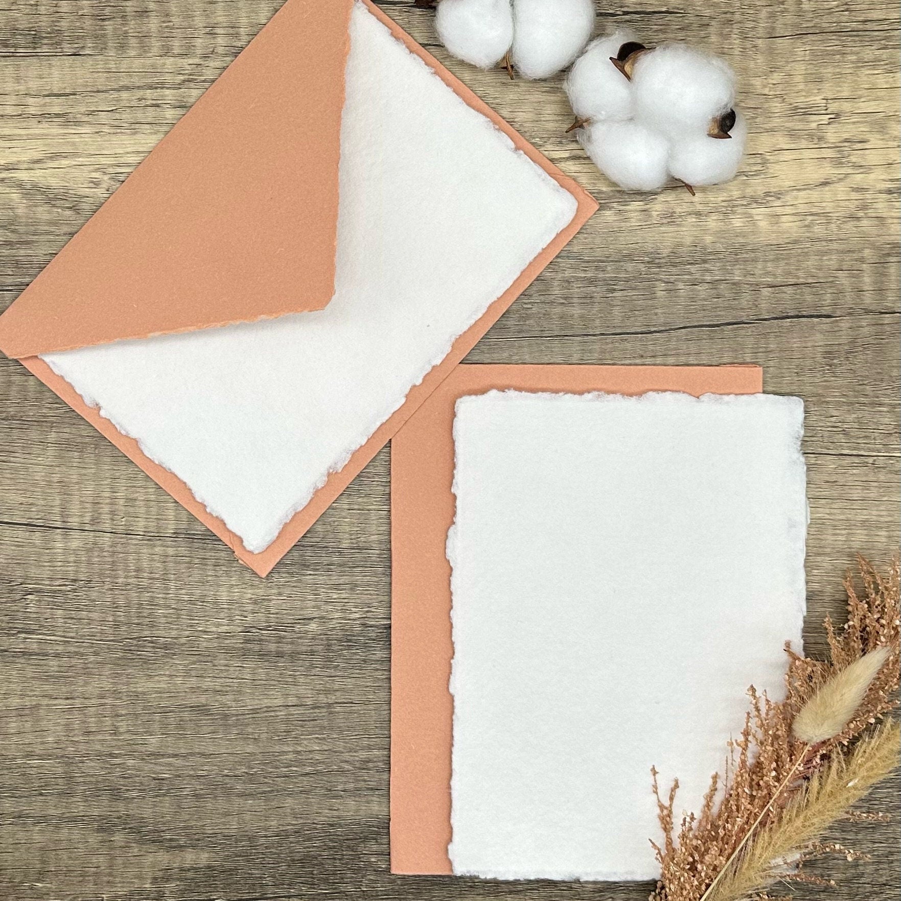 This listing includes a set of 10 Coral Peach handmade envelopes crafted from 100% recycled cotton rag paper. Each piece showcases a beautifully deckled edge that adds a touch of elegance and rustic charm. These invitation sets are perfect for announcing your wedding with grace and environmental consciousness.