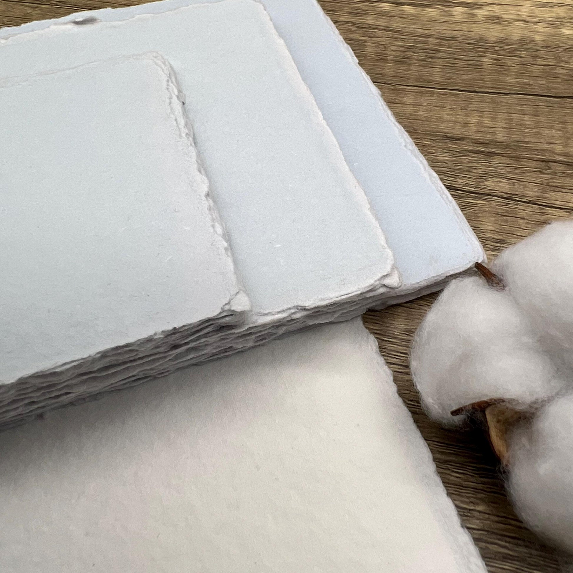 Discover the versatility of our Light Blue Handmade Cotton Paper. Perfect for weddings, art, calligraphy, or stationery, this premium paper brings artisanal quality to every project. Available in 150gsm and 300gsm weights and multiple sizes, this deckle-edged paper is a must-have for any creative endeavor.