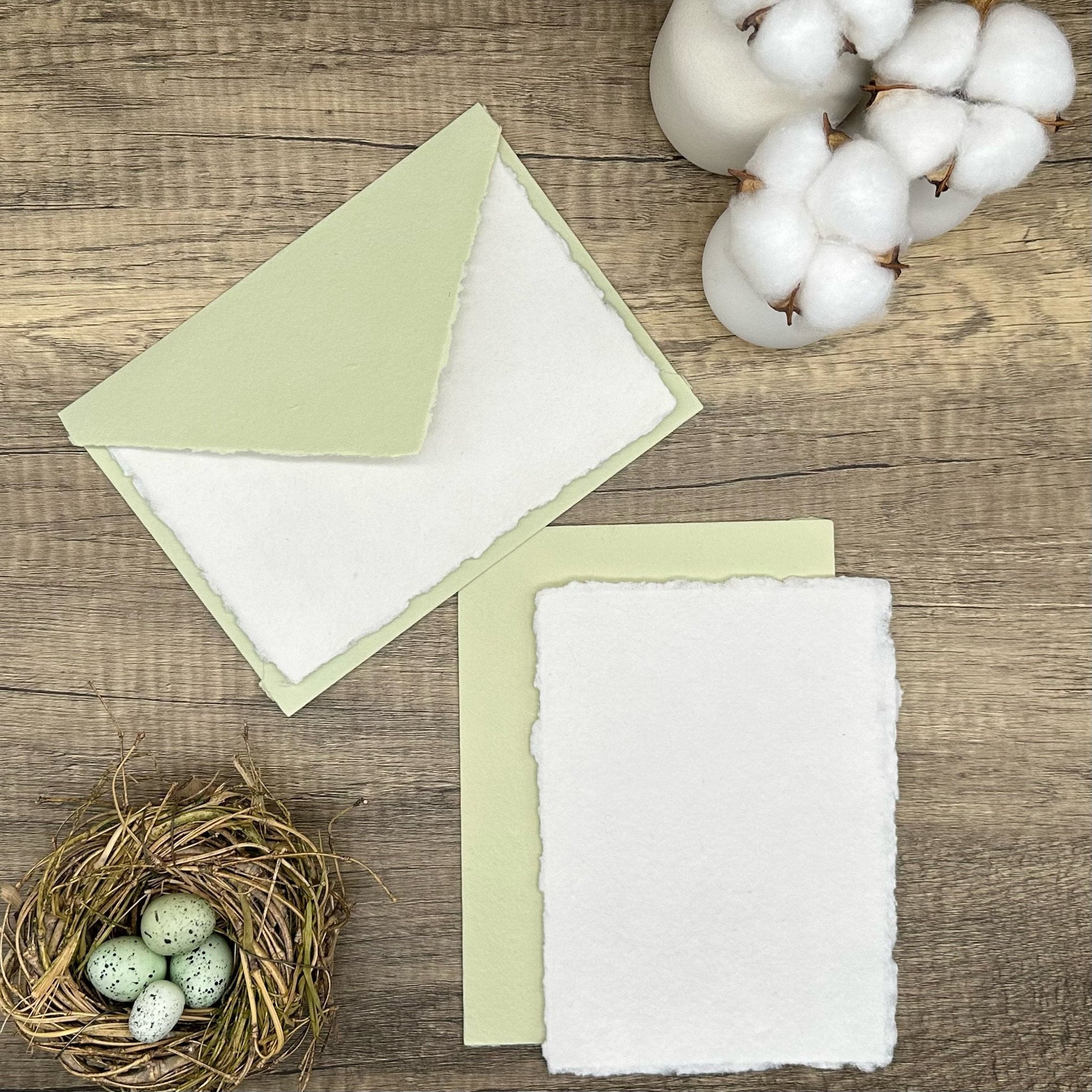 This listing includes a set of 10 Light Green/Honeydew handmade envelopes crafted from 100% recycled cotton rag paper. Each piece showcases a beautifully deckled edge that adds a touch of elegance and rustic charm. These invitation sets are perfect for announcing your wedding with grace and environmental consciousness.